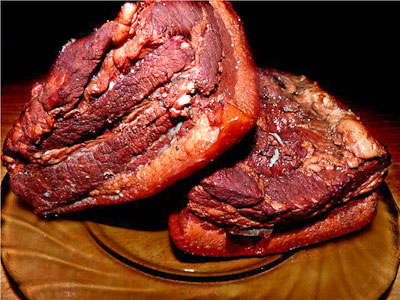 Залить 2 л воды две пригоршни промытой луковой шелухи, можно положить несколько веточек вишни, всыпать 1 ст. соли, кипятить 10 мин. Опустить сало весом 2 кг (лучше брать грудинку с прослойкой мяса), варить 30-40 мин., остудить в этом же рассоле. Вынуть, натереть измельченным чесноком и молотой паприкой, можно еще и любимыми пряностями. Подать к столу, нарезав кусочками.