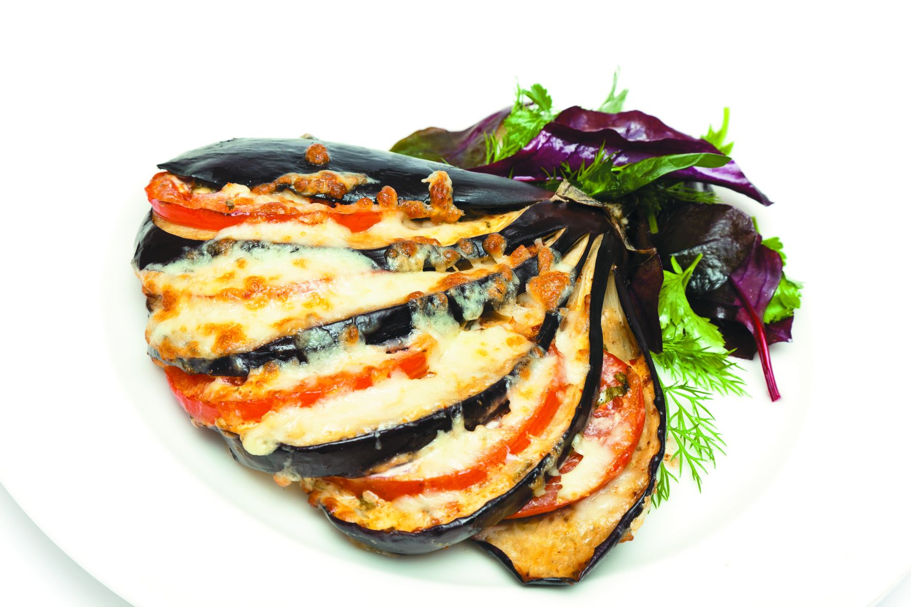 3. Пластинки баклажанов натереть чесноком, затем выложить между ними кружочки помидоров и сыр, выложить на смазанный растительным маслом противень и смазать майонезом. Запекать при 180 °С около 30-40 мин. Блюдо подать на стол горячим, украсив петрушкой.