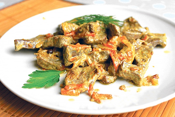 Печенку залить водой, оставить на час. Нарезать кусочками и обжарить. Отдельно протушить нарезанные капусту, перец и лук. Добавить печенку, сливки, пряности, посолить и тушить 10-15 мин.