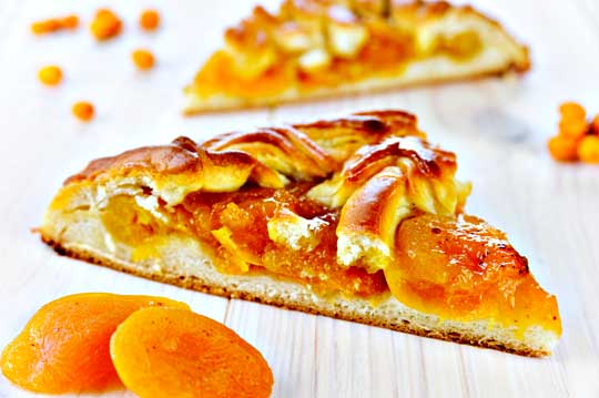 4. Для приготовления начинки курагу залейте кипятком и дайте ей набухнуть. Лимон, курагу, орехи и клюкву пропустите через мясорубку, добавьте сахар и перемешайте.