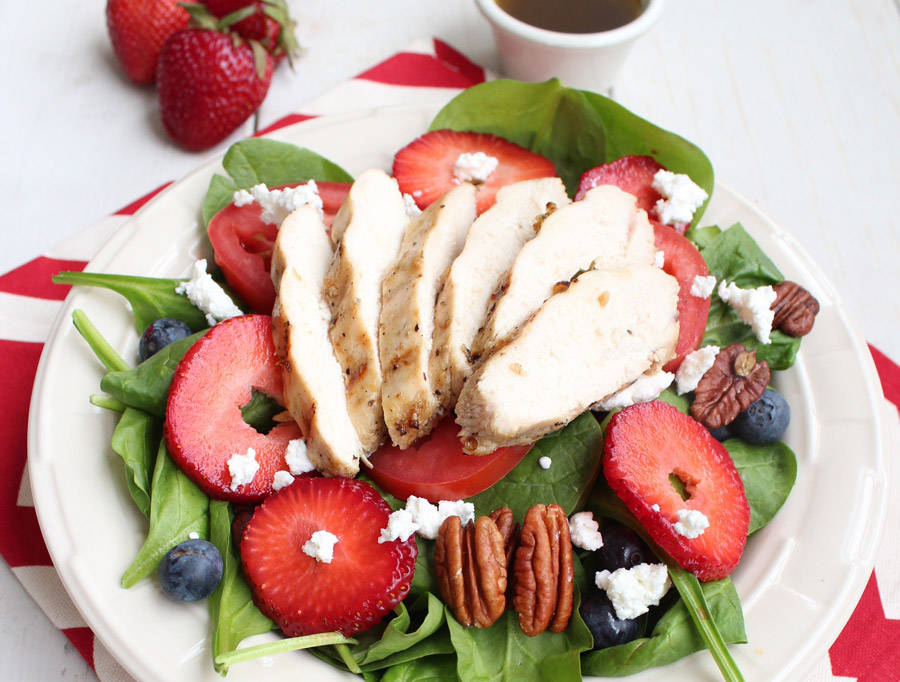 Листовые салаты вымыть и обсушить, крупные листья нарвать. Разложить салаты по порционным тарелкам, выложить на них помидоры, землянику и сыр. Перед подачей полить соусом и хорошо поперчить.