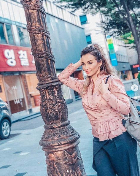 Чтобы иллюстрировать свои слова она опубликовала несколько фотоснимков, на которых позирует в стильном наряде из нюдойвой блузы и серых брюк во время прогулки по улицам Сеула.