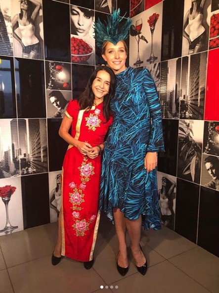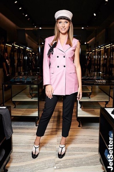 Теледива блистала на публике в черных брюках и розовом жакете от бренда GASANOVA; в черном комбинезоне и серебристом жакете; в принтованном голубом платье от Ольги Навроцкой; а также в пятнистом костюме розового оттенка от бренда Navro.