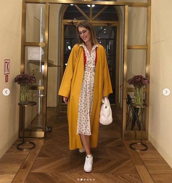На новом снимке Ксения продемонстрировала осенний аутфит, пишет storinka.com.ua. Образ теледивы состоял из принтованного платья от Александра Терехова, желтого пальто Masterpeace, белых кроссовок и оригинальной сумки в тон от Maison Margiela.