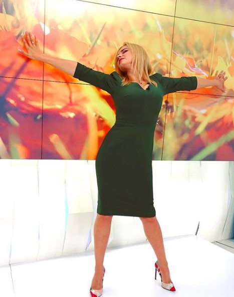 За прошедшую неделю телеведущая успела продемонстрировать 5 стильных нарядов: вечернее платье черного цвета с перьями на лифе, зеленое и розовое платье-футляры, зеленый сарафан в пол и белый брючный костюм с черным топом.