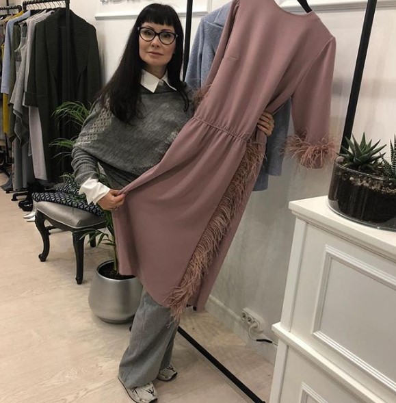 На фото, что появилось в микроблоге Нонны, она держит в руках платье лаконичного кроя с перьями на подоле и манжетах.