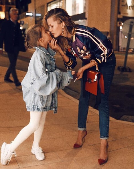 На фото Боня трогательно целует дочь во время прогулки по улице. Одета при этом теледива в стильный аутфит, который состоит из джинс, принтованного бомбера и красных туфлей.