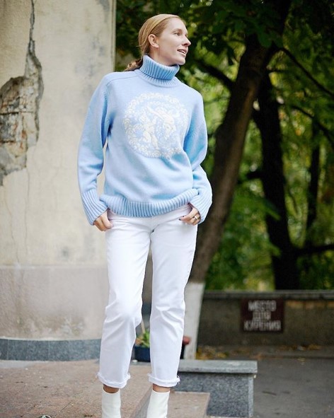 Катя Осадчая продемонстрировала подписчикам стильный аутфит, который состоял из белых брюк и голубого свитера от бренда Tak.Ori by Lana Takori, пишет storinka.com.ua.