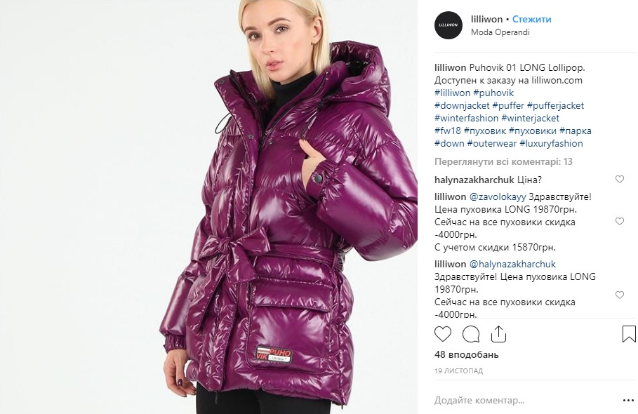 Позировала Лилия в черно-белых принтованных брюках и фиолетовом пуховике. Кстати, стоимость такой куртки – 15 870 гривен (а до скидок она стоила 19 790 гривен).