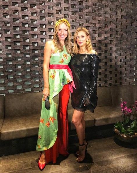 На снимке Татьяна запечатлена в маленьком черном платье, расшитом пайетками, а Катя – в красных брюках и асимметричном топе салатового цвета с цветочным принтом.