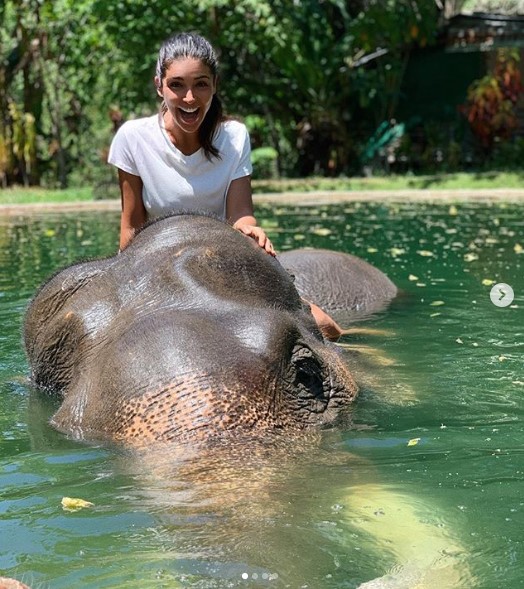 Знаменитость поделилась фотоснимками, на которых позирует верхом на слонах, а в подписи к кадрам рассказала интересные факты об этих животных. Также Димопулос пояснила: «я не каталась на нем, только фото в воде…».