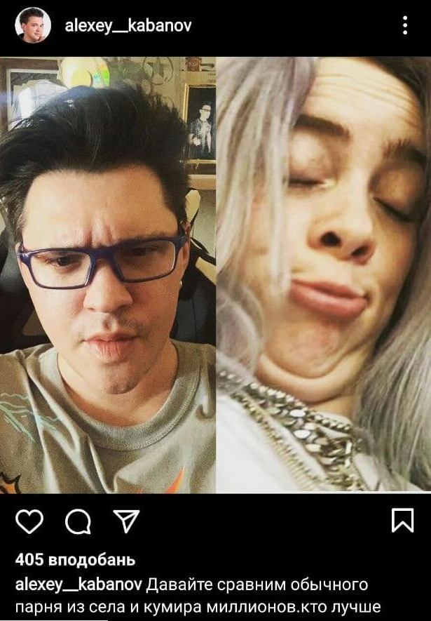 И завершает "трилогию" пост :"Давайте сравним обычного парня из села и кумира миллионов. Кто лучше выглядит ?", к которому Кабанов прикрепил коллаж - свое фото и фото Айлиш.