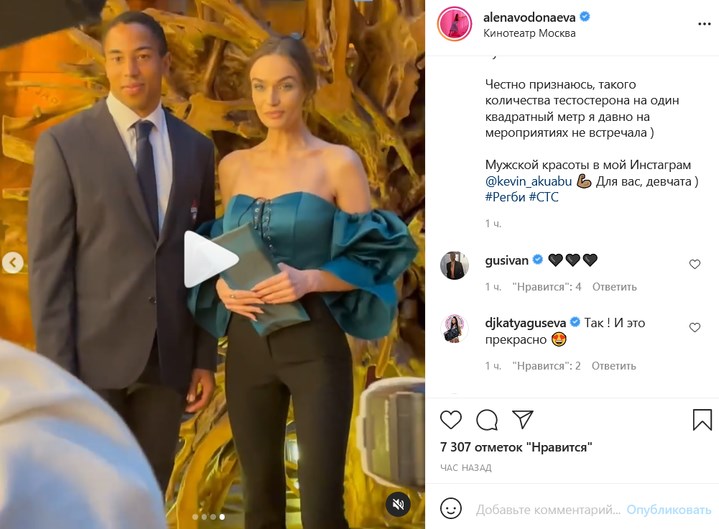 Водонаева опубликовала несколько кадров и видеоролик, на которых запечатлена с российским регбистом Кевином Акуабу.