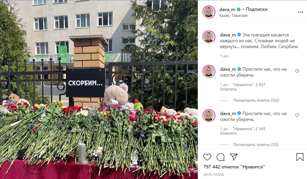 Репер Давид Манукян возложил цветы к стихийному мемориалу в Казани, где произошла стрельба в школе. Фанаты сочли это попыткой привлечения внимания.