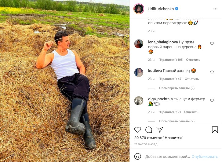 «Ну прям первый парень на деревне!», «Гарный хлопец», «Сапоги зачетные», «Фото вообще улет!!! Ты и сено — это просто романтика!», «О боже, какой мужчина», «Гармошки не хватает в этом фото», «Вот она — жизнь. Красота! Только там вдвоем лежать лучше», «Класс!!! Натуральная красота», — восхищаются поклонники в комментариях.