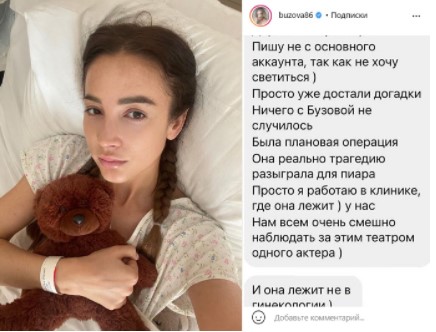 А еще в её последнем посте на тему тяжелого восстановления, появился коммент сотрудника клиники, который и рассказал, что это была обычная плановая операция и все, кто об этом знают, теперь со смехом наблюдают за этим театром одного актера.