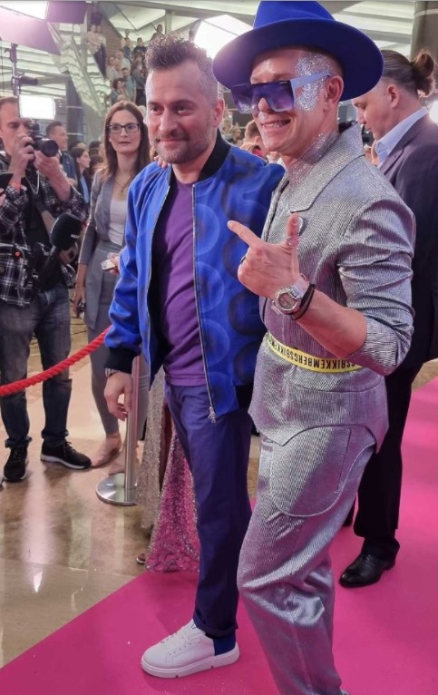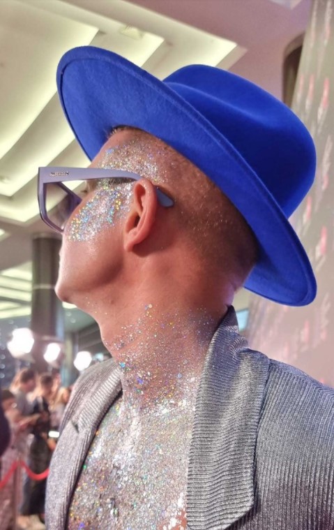 В апреля исполнилось 60 лет со дня первого полета человека в космос. Космический дресс-код был обязателен и для гостей музыкальной премии. Митя Фомин подошел к делу с большой фантазией – обклеил виски и сексуальный торс серебряными пайетками. Аки галактическая пыль прилипла! Очень эффектно!