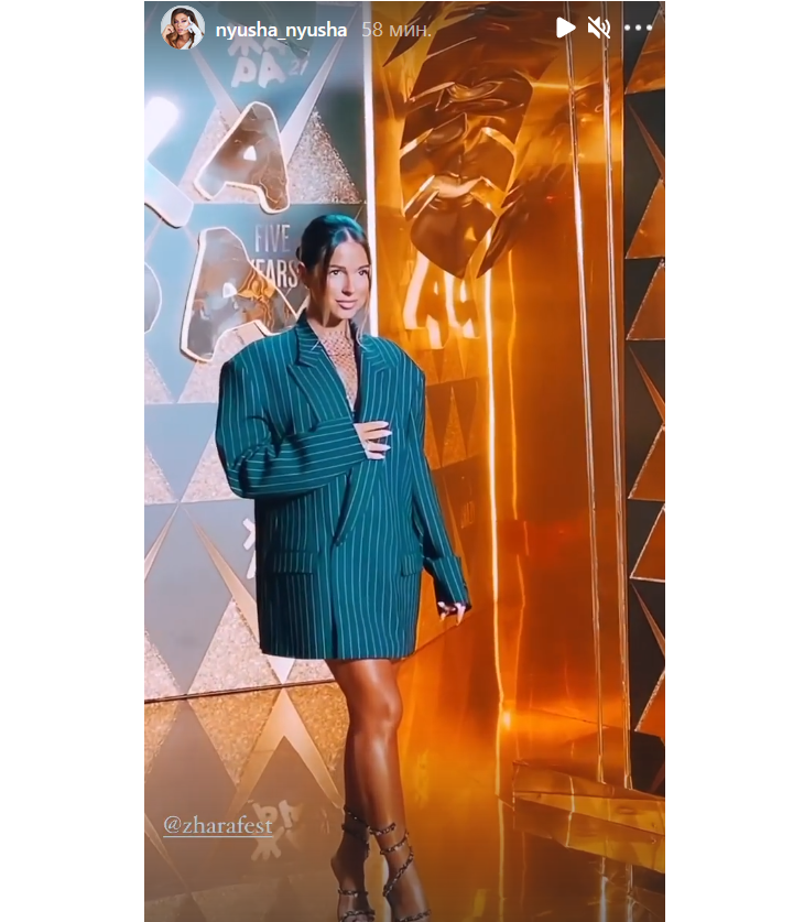Для этого события певица нарядилась в объемный черный жакет в тонкую белую полоску, сделала гладкую прическу и выразительный макияж. Образ Нюша дополнила босоножками на шпильках.