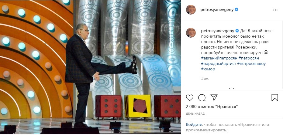 75-летний юморист, недавно ставший молодым отцом, решил показать фанатам, на какие еще подвиги он способен в своем почтенном возрасте. Артист опубликовал в "Инстаграм" фото с выступления, во время которого он стоит на сцене, вытянув вперед прямую ногу – в так называемой позе "пистолетиком". Евгений Петросян признался, что прочитать монолог в таком положении было не так-то просто, но ради удовольствия зрителей он пошел на это.
