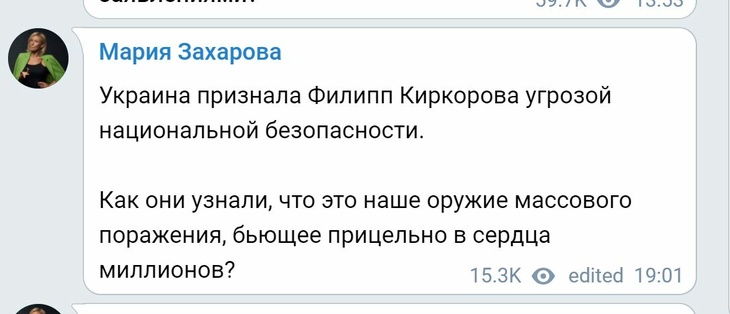 Официальный представитель МИД РФ Мария Захарова иронично прокомментировала внесение певца Филиппа Киркорова в «черный список» Минкульта Украины.
