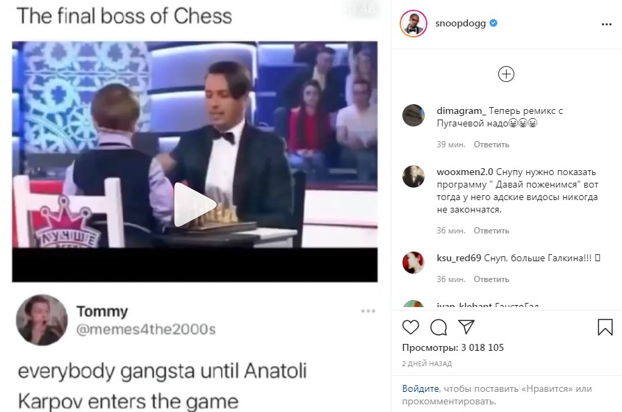 Американский рэпер и продюсер Снуп Догг опубликовал на своей странице в Instagram мем с Максимом Галкиным и юным шахматистом, удивив россиян.