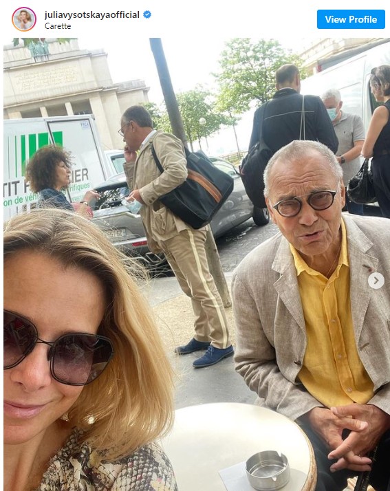 Актриса опубликовала на своей официальной страничке в социальной сети «Инстаграм» новую фотографию. Юлия Высоцкая и Андрей Кончаловский сфотографировались в Париже. Супруги посетили одно из местных кафе. Актриса и режиссер сделали заказ, который смогли разглядеть все желающие.