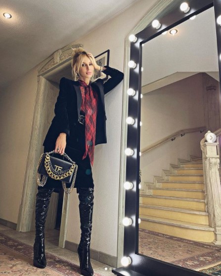 На фото можно увидеть, как звезда позирует перед зеркалом. На звезде высокие черные сапоги-ботфорты, черные короткие брюки и черный жакет. Ярким пятном выступает рубашка в клетку от Yves Saint Laurent. Другим люксовым предметом гардероба стал аксессуар-сумка от Tom Ford.