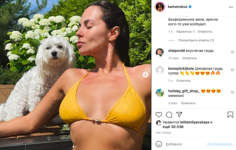 «Какая красотка»; «Шикарная грудь. Супер»; «Ух, какая»; «Соблазнительная девушка»; «Вкуснячая грудь»; «До чего привлекательная. Повезло Потапу», — высказались пользователи Сети