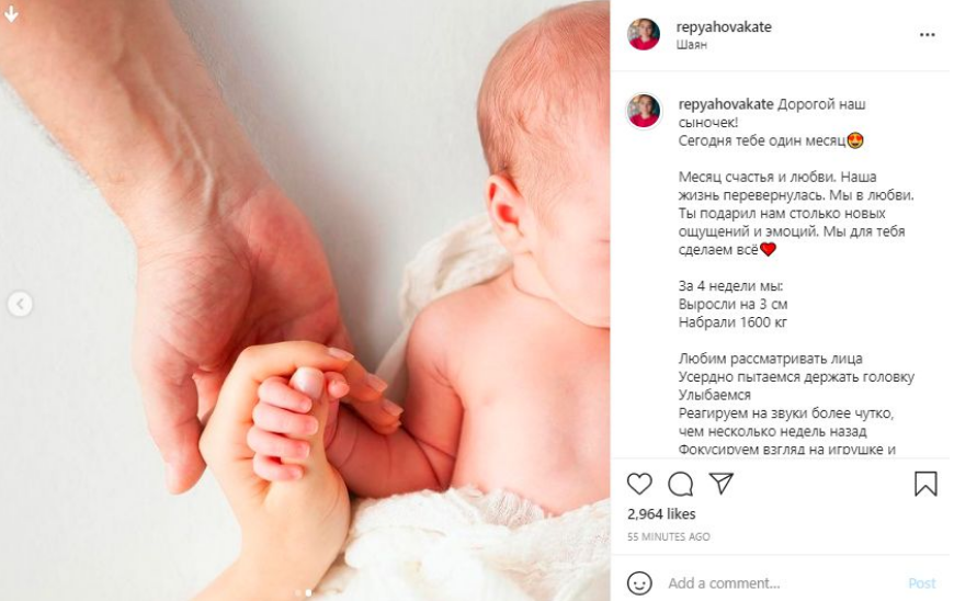Прошло уже четыре недели со дня рождения малыша, и в четверг, 15 июля, Екатерина решила рассказать, какими достижениями сына она гордится спустя месяц. Девушка написала в Инстаграме, что Михаил вырос на 3 см и набрал 1600 кг.