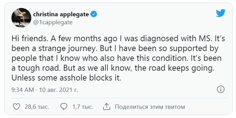 "Это было удивительное путешествие. Но меня очень сильно поддерживали люди, у которых тоже есть это заболевание. Это был трудный путь. Но, как все мы знаем, дорога продолжается. Если только какой-либо кретин ее не заблокирует ", - написала актриса.
