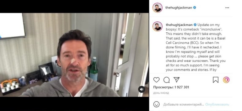 Австралийский актер, известный по роли Росомахи в саге о «Людях Икс», заставил поклонников поволноваться. На своей странице в Instagram он опубликовал видео, где показал новообразование на носу и поделился результатами анализов биопсии, которые были сделаны для проверки актуального состояния карциномы, одного из самых распространенных видов рака кожи.