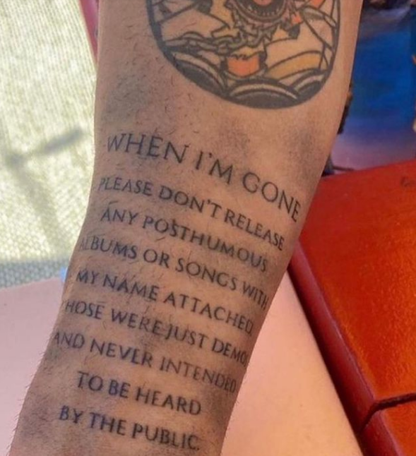 Она рассказала об этом, после того, как музыкант Андерсон Пак раскритиковал издание записей после ухода их исполнителей из жизни. Он опубликовал в личном микроблоге фото новой татуировки, которая представляет собой текст: "Когда я умру, пожалуйста, не выпускайте моих песен. Это были всего лишь демоверсии, и они не предназначались для того, чтобы их услышала публика".