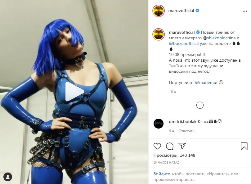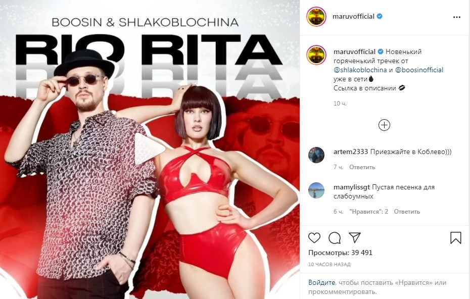 Выступающая в РФ украинская певица Maruv на своей странице в Instagram 10 августа сообщила о выходе песни Rio Rita ее альтер-эго Shlakoblochina и музыканта Boosin.