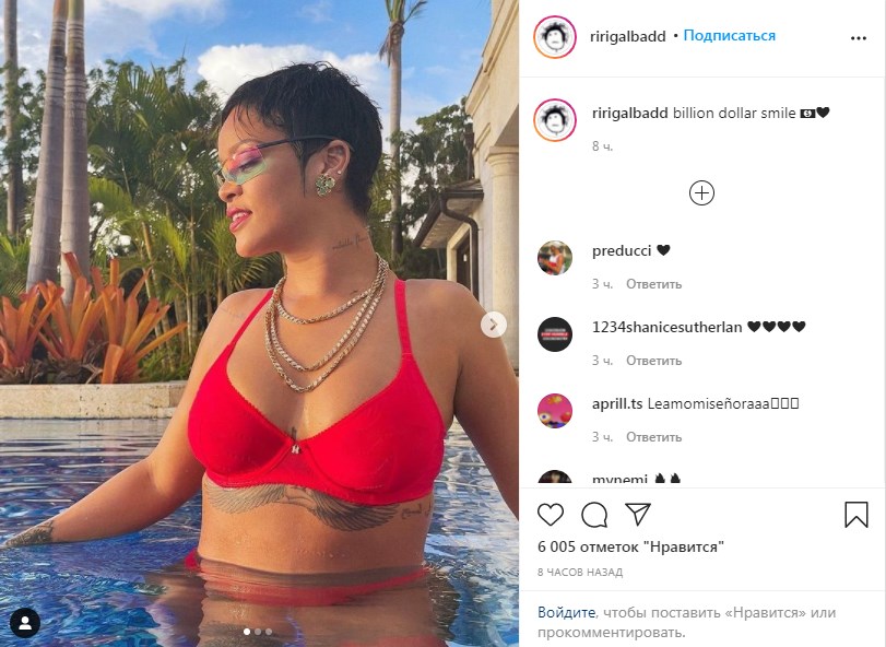 Американская певица Рианна снова удивила поклонников. Запечатлевшись в бассейне, она тем самым выбрала одну из самых выигрышных позиций, чтобы продемонстрировать нижнее белье. Наверняка многих смутит, что звезда выбрала для этого вовсе не купальник.