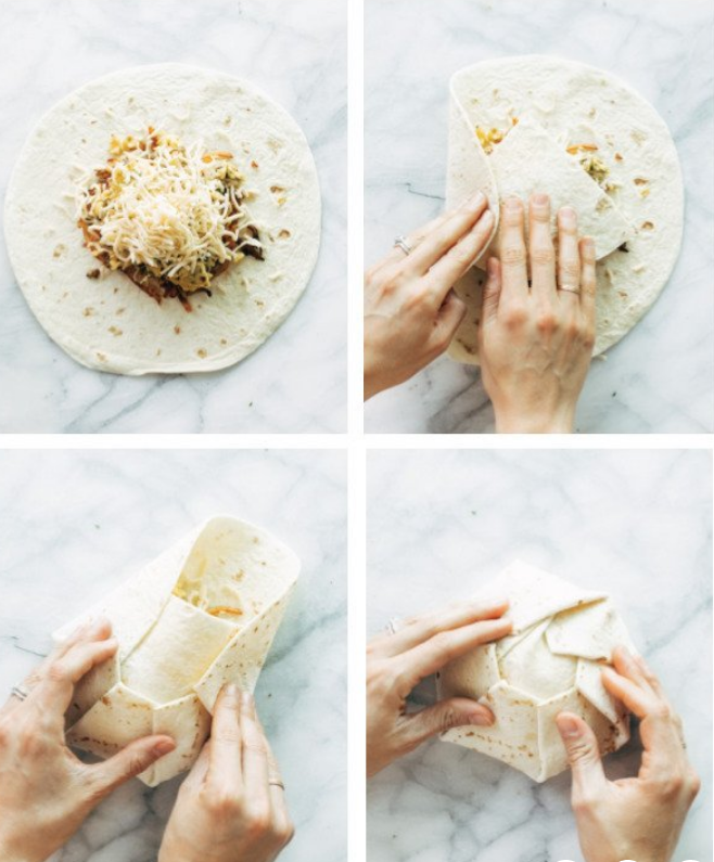 - Одну из лепешек разрезать на четыре части. Остальные лепешки разложить на столе и в центр каждой выложить 1/4 начинки. Сверху посыпать сыром, положить четвертинку лепешки и завернуть края по кругу, в форме звезды.