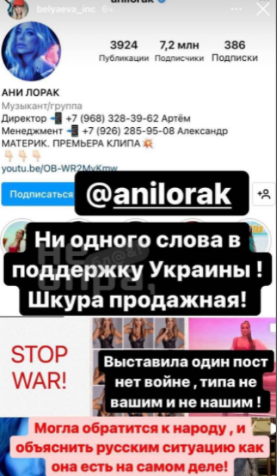 Модель отметила, что певица ни слова не сказала в поддержку родной страны. «Шкура продажная. Один пост «Нет войне» — это как? И вашим, и нашим? Ты бы могла выразить слова поддержки своему народу, сказать что-то русским о ситуации, которая происходит в реальности!», — пишет Беляева для Лорак.