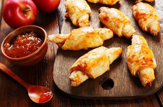 - Каждый квадрат намажь джемом и сверни в аккуратный рулетик. Лучше брать плотный, не жидкий джем с небольшой кислинкой: сливовый, яблочный, абрикосовый