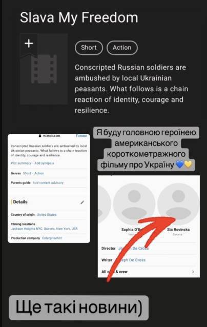 Ведущая канала 1+1 Стася Ровинская, дочь скандальной решистки Снежаны Егоровой, снимется в главной роли в американском короткометражном фильме об Украине Slava My Freedom. Об этом она сообщила в Инстасториз.