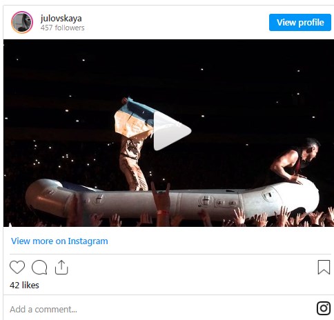 На концерте члены группы "проплывают" в надувной лодке над толпой фанатов. Клавишник Кристиан Лоренц размахивает желто-голубым флагом под бурные аплодисменты.