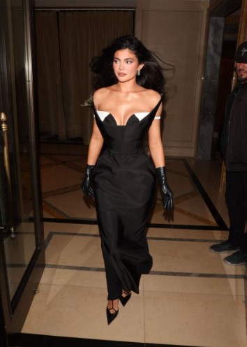Для звездной вечеринки Кайли выбрала облегающее черное платье-бюстье с открытыми плечами от Хайдера Акерманна. Свой образ Дженнер дополнила черными латексными перчатками, черными туфлями на каблуках и впечатляющими бриллиантовыми серьгами.
