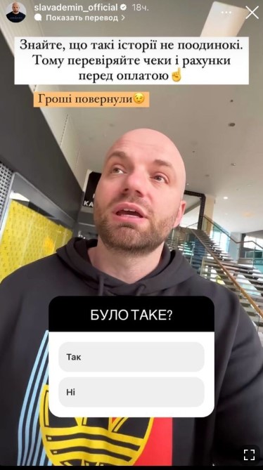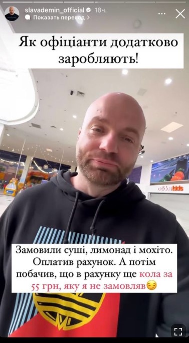 "Нам принесли чек за суши. Мы заказали суши, мохито и лимонад. Нам принесли чек, я оплатил и потом в чеке я увидел, что там дополнительные 55 гривен за Coca-Cola, которую мы не заказывали. Когда позвал официантку, была такая реакция : "Боже, это наверное как-то случайно произошло", — рассказал ведущий.