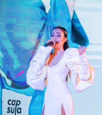 Артистка в наряде от украинского дизайнера продемонстрировала стройную фигуру.