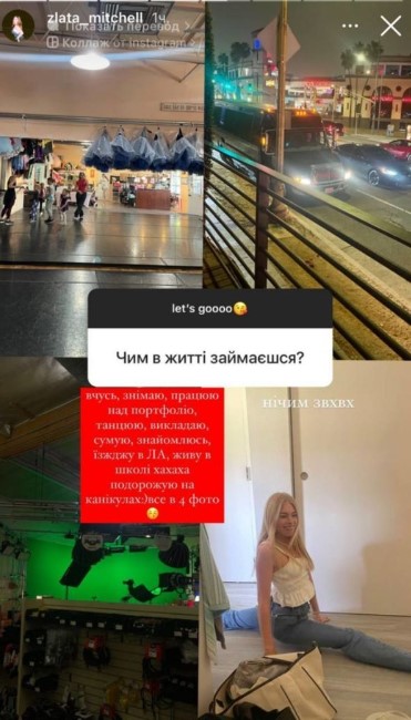 "Учусь, снимаю, работаю над портфолио, танцую, преподаю, скучаю, знакомлюсь, езжу в Лос-Анджелес, живу в школе, путешествую на каникулах", — поделилась Злата.