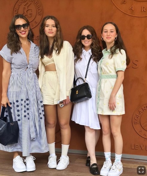 Для посещения турнира Джессика выбрала легкое белое платье в голубую полоску с эффектным декольте, дополненное белыми кроссовками и солнцезащитными очками. А 15-летняя Онор предпочла более раскрепощенный образ и надела шорты и коротенький топ молочного цвета, который прикрыла легкой рубашкой в тон.