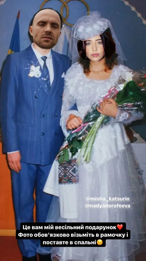 Никитюк использовала свадебное ретрофото, на котором заменила лицо молодоженов изображениями Кацурина и Дорофеевой. Пост она публиковала в Instagram Stories.