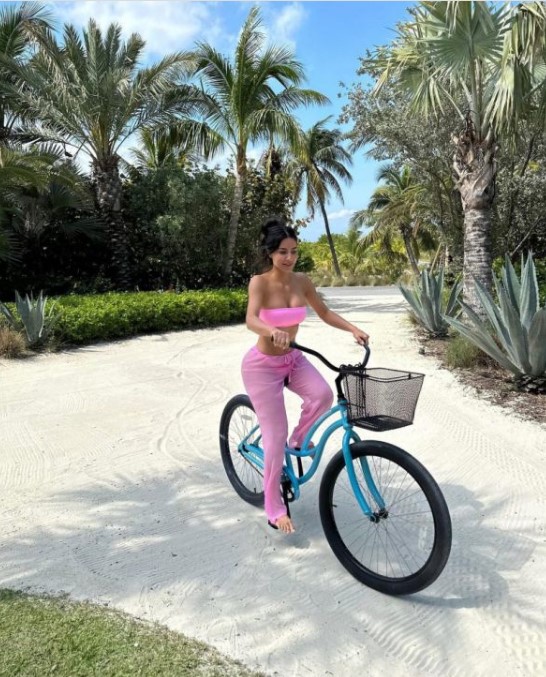 Ким продолжает продвигать летнюю коллекцию своего бренда SKIMS. На этот раз она примеряла ансамбль розового цвета и поддержала тренд barbiecore. Знаменитость одела соблазнительное бикини и добавила к нему прозрачные штаны, чтобы ноги не сгорели на отдыхе.