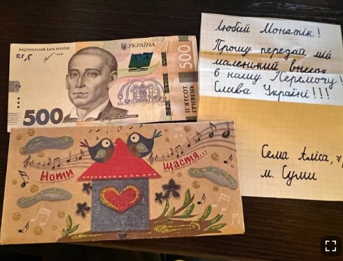 Семилетняя девочка Алиса из города Сумы написала особую просьбу к любимому артисту. Как показал Монатик в Instagram, школьница вместе с письмом передала ему 500 гривен, которые попросила передать на приближающуюся нашу победу.