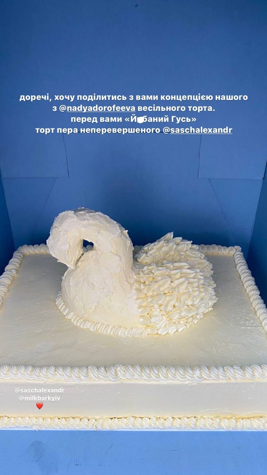 "Хочу поделиться с вами концепцией нашего с Надей свадебного торта. Перед вами "Й*баный Гусь". Кстати, по вкусу "Й*баный Гусь", это киевский торт", – рассказал Кацурин.