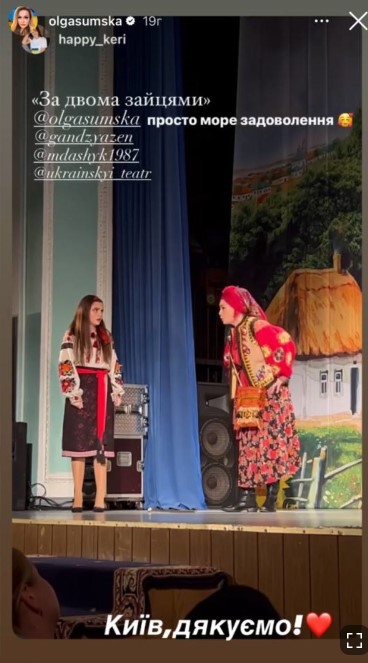 В настоящее время театральная труппа находится на гастролях. После Киева Ольга Сумская вместе с дочерью отправилась дальше играть спектакль "За двумя зайцами".