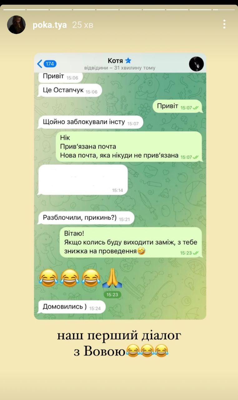 В сторонах Полтавская показала первую переписку с Остапчуком. Оказалось, что телеведущий обратился к ней за помощью, потому что Инстаграм заблокировал его страницу. Полтавская помогла решить проблему, однако попросила об услуге.